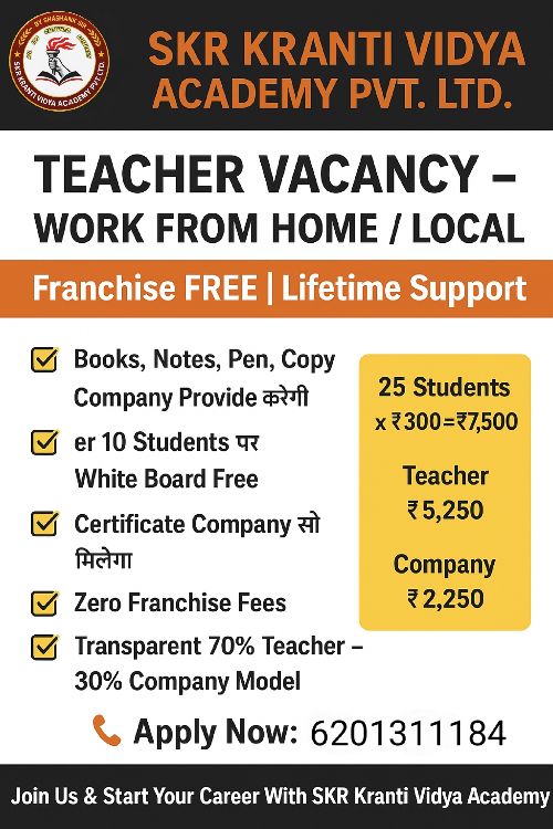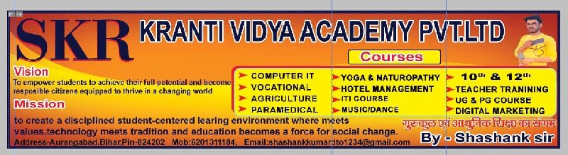 Welcome to SKR Kranti Vidya Academy Pvt. Ltd. Founder: Shashank Sir "IndiaтАЩs 1st Gurukul + Modern Education Academy" ЁЯУЪ рд╣рдорд╛рд░рд╛ рдЙрджреНрджреЗрд╢реНрдп: SKR Kranti Vidya Academy Pvt. Ltd. рдХрд╛ рдорд┐рд╢рди рд╣реИ рдЖрдзреБрдирд┐рдХ рд╢рд┐рдХреНрд╖рд╛ рдХреЛ рдЧреБрд░реБрдХреБрд▓ рд╕рдВрд╕реНрдХреГрддрд┐ рдФрд░ рд╕рдВрд╕реНрдХрд╛рд░реЛрдВ рдХреЗ рд╕рд╛рде рдЬреЛрдбрд╝рдХрд░ рдЫрд╛рддреНрд░реЛрдВ рдХрд╛ рд╕рд░реНрд╡рд╛рдВрдЧреАрдг рд╡рд┐рдХрд╛рд╕ рдХрд░рдирд╛ред рд╣рдо рди рдХреЗрд╡рд▓ рд╢рд┐рдХреНрд╖рд╛ рдореЗрдВ рдЙрддреНрдХреГрд╖реНрдЯрддрд╛ рдкреНрд░рджрд╛рди рдХрд░рддреЗ рд╣реИрдВ, рдмрд▓реНрдХрд┐ рд╡рд┐рджреНрдпрд╛рд░реНрдерд┐рдпреЛрдВ рдХреЗ рдЪрд╛рд░рд┐рддреНрд░рд┐рдХ рдФрд░ рд╕рд╛рдорд╛рдЬрд┐рдХ рд╡рд┐рдХрд╛рд╕ рдкрд░ рднреА рдзреНрдпрд╛рди рджреЗрддреЗ рд╣реИрдВред рд╣рдорд╛рд░реЗ рдХреЛрд░реНрд╕реЗрдЬ рдФрд░ рд╕реЗрд╡рд╛рдПрдБ: рдХрдХреНрд╖рд╛ 1 рд╕реЗ 12 рддрдХ рдХреА рдкрдврд╝рд╛рдИ Govt. Exam Coaching: Railway, SSC, Banking, Police рдЖрджрд┐ Computer Courses: ADCA, DCA, Tally, Typing, Digital Marketing, AI UG/PG/Engineering Coaching Yoga, Ayurveda & Gurukul Learning CSC & Stationery Services Franchise & Partnership Opportunities Tagline: "рдмреБрджреНрдз рд╣реА рд╢рд┐рдХреНрд╖рд╛ рдХрд╛ рдХреЗрдВрджреНрд░ред рд╕рддреНрдп рдФрд░ рд╣реА рд╕рдВрд╕реНрдХрд╛рд░ рд╣реИред" Contact Details: ЁЯУН Head Office: Deo, Aurangabad, Bihar ЁЯУЮ 6201311184 ЁЯМР Website: skacademyjharkhand.in ЁЯУз Email: shashankkumardto1234@gmail.com